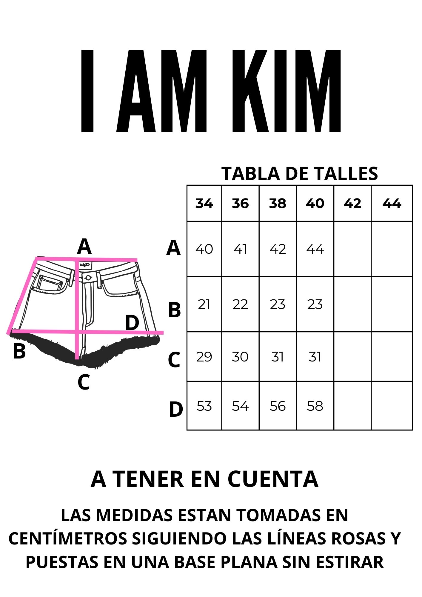 Short de jeans tiro bajo. Las medidas se toman siguiendo las líneas de color fucsia