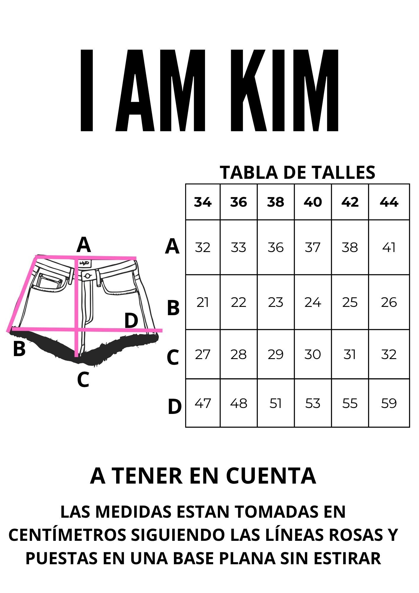 Short de jeans tiro bajo. Las medidas se toman siguiendo las líneas de color fucsia